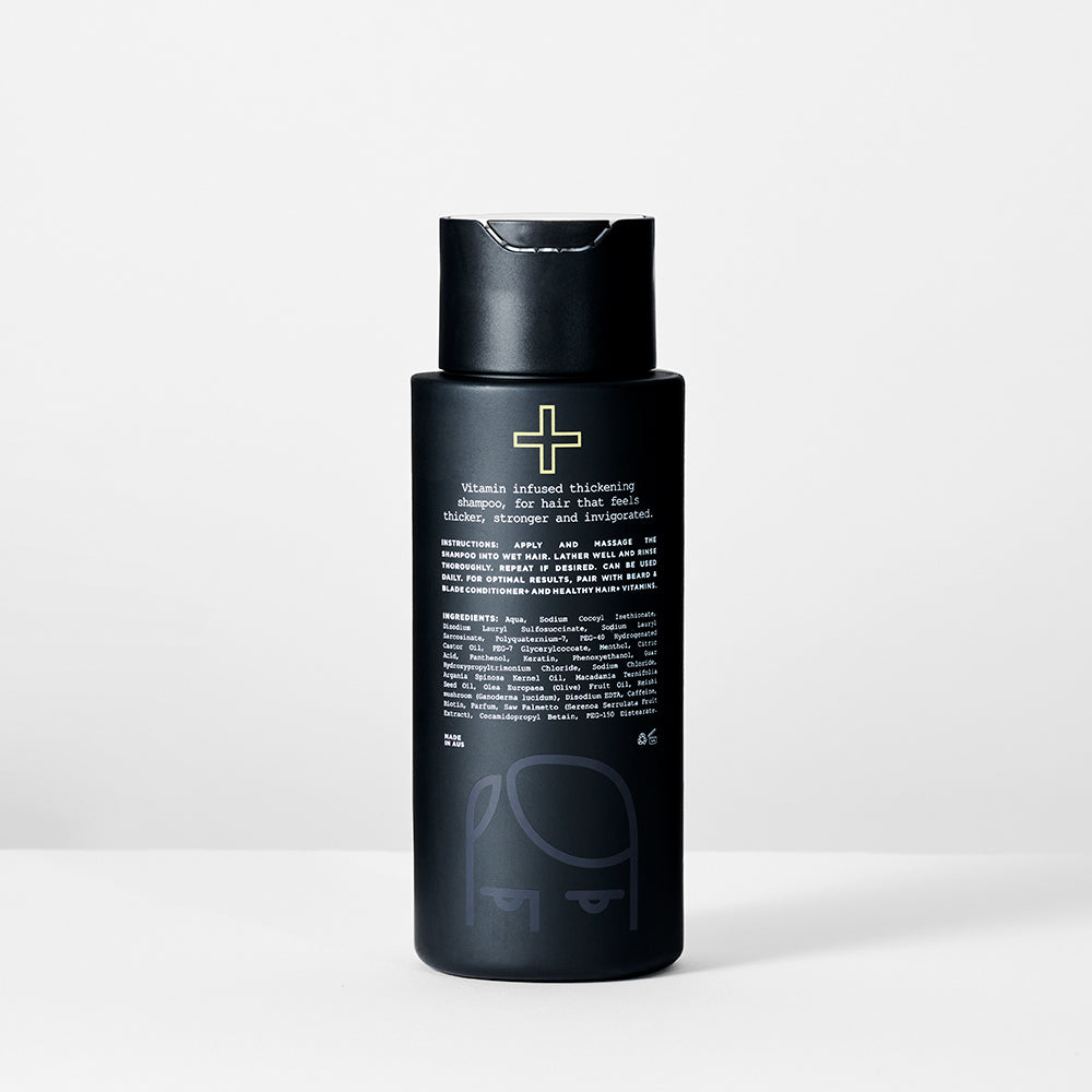 Introducing our Beard & Blade Hair Thickening Shampoo+, the ultimate solution for thinning hair. Formulated with a powerful blend of natural ingredients, including Reishi mushroom, Biotin, and Saw Palmetto, this powerful vitamin-infused shampoo gently cleanses and thickens your hair, leaving it looking fuller, healthier, and more voluminous.