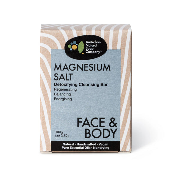 The Australian Natural Soap Company Magnesium Salt Detoxifying Cleanser. Refresh and rehydrate dry skin with this mineralised, sea salt-infused wonder bar. Magnesium as a treatment for exhausted, out-of-whack muscles and sea salt for pore-unblocking, bacteria-inhibiting deep but gentle cleansing. Together they moisturise, balance, and help prevent breakouts and blemishes.